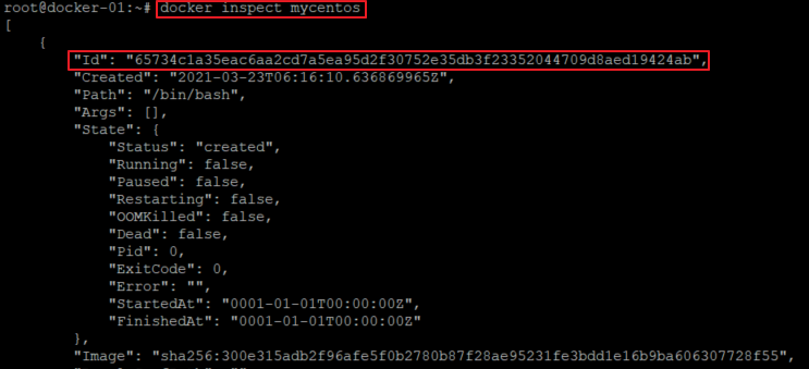 # docker inspect mycentos | grep Id