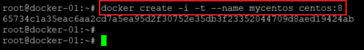 # docker create -i -t --name mycentos centos:8