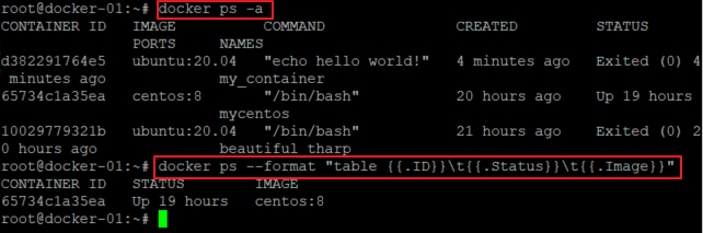 - ps 명령어의 출력 결과가 줄바꿈되어 알아보기 힘들 때는 --format 옵션에 {{.ID}}\t{{.Status}}와 같은 Go 템플릿을 입력해서 원하는 정보만 출력 가능