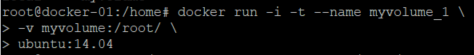 # docker run -i -t --name myvolume_1 -v myvolume:/root/ ubuntu:14.04