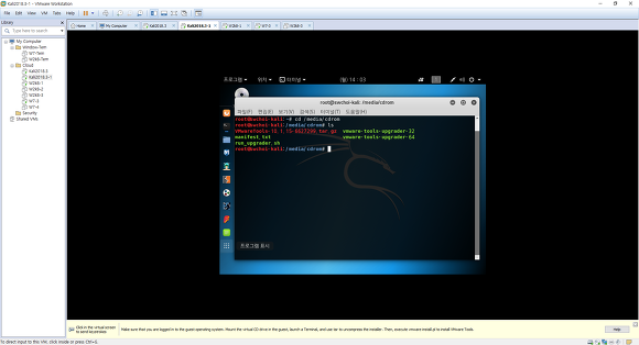 칼리리눅스 바탕화면 부분에 CD모양이 자동으로 마운트 된것을 볼 수 있다.