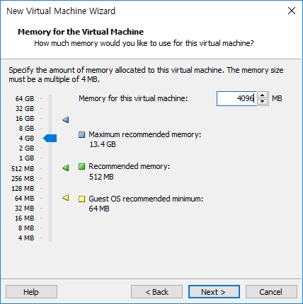 실제 PC의 메모리가 16GB 이기 때문에 넉넉하게 4GB를 준다.